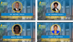 Panelists Dr. Wayne J. Riley, Dr. Sandra Scott, Sonia Sekhar, and Camille Hastick