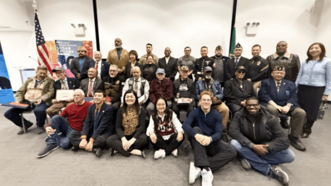 Council Member Susan Zhuang (front row, 3rd from right), Assemblyman William Colton (back row, 2nd from right), and staff gathered with veterans for a group photo. Photo Credit: Helen Klein